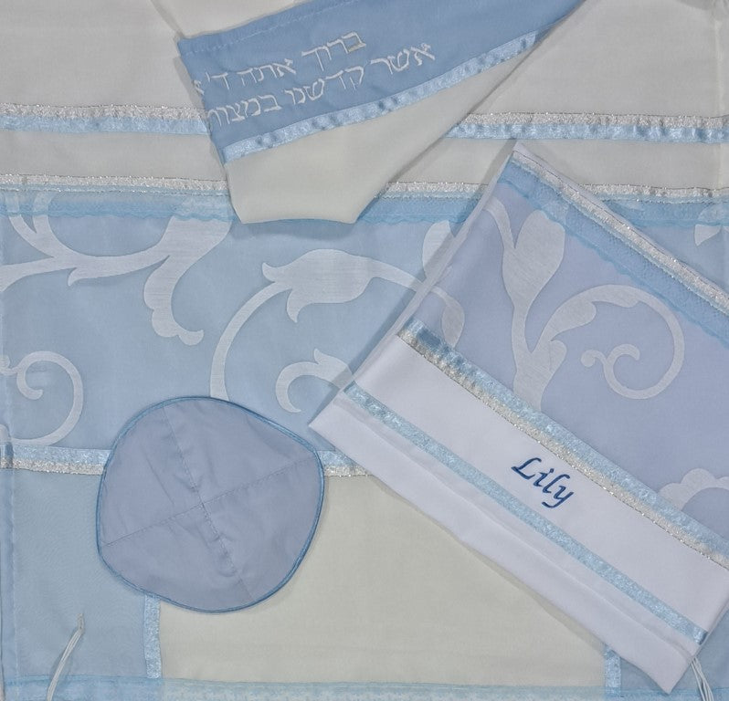 Like our other Bat Mitzvah Tallits, Girls Tallits and Tallits for Women it is sold in a set of Tallit, with a matching Tallit bag and kippah.