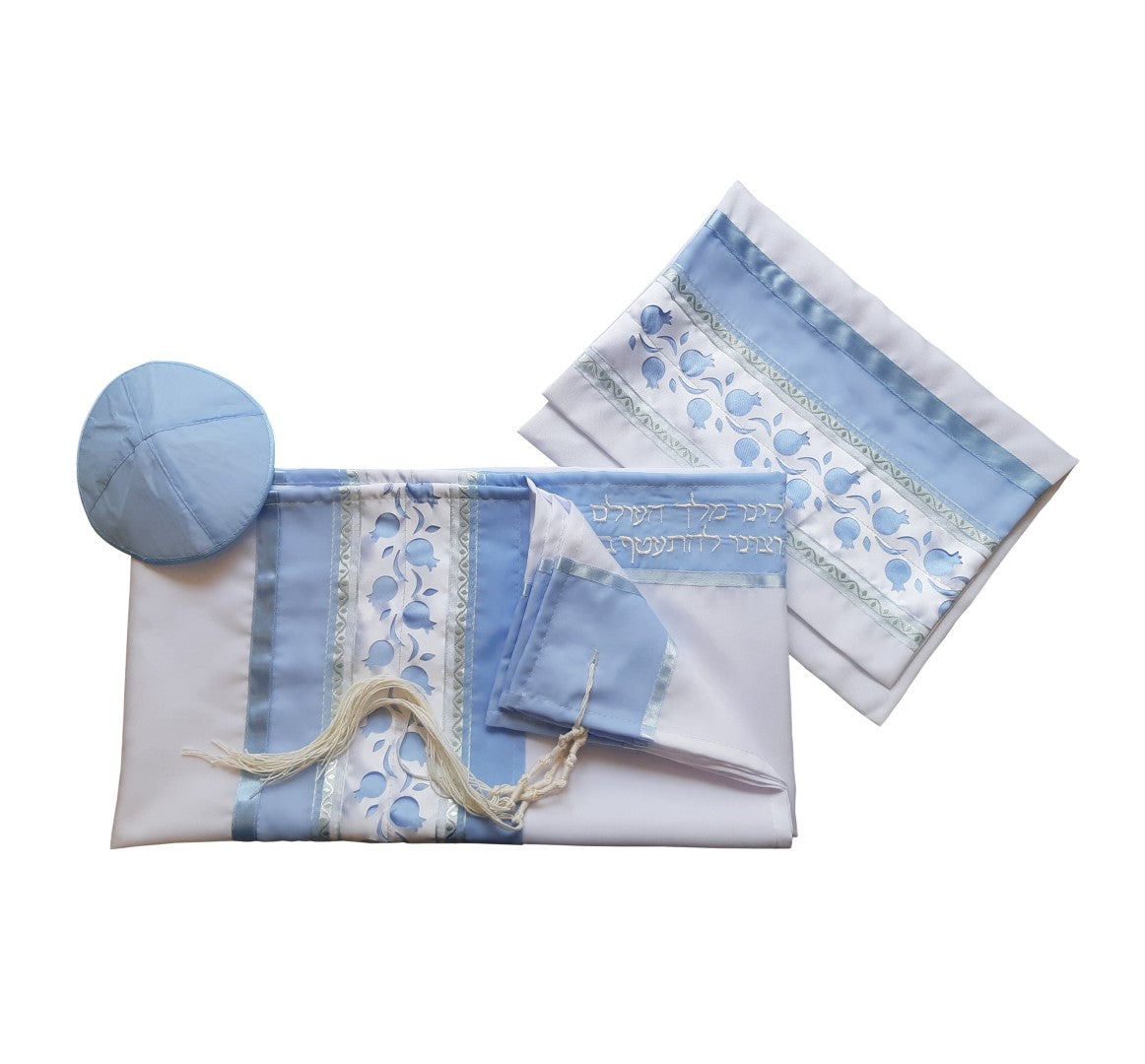 The Light Blue Pomegranates Tallit for Women, Bat Mitzvah tallit, Women's Tallit is adorned with tiny pomegranates decorations, a symbol of ancient Israel.