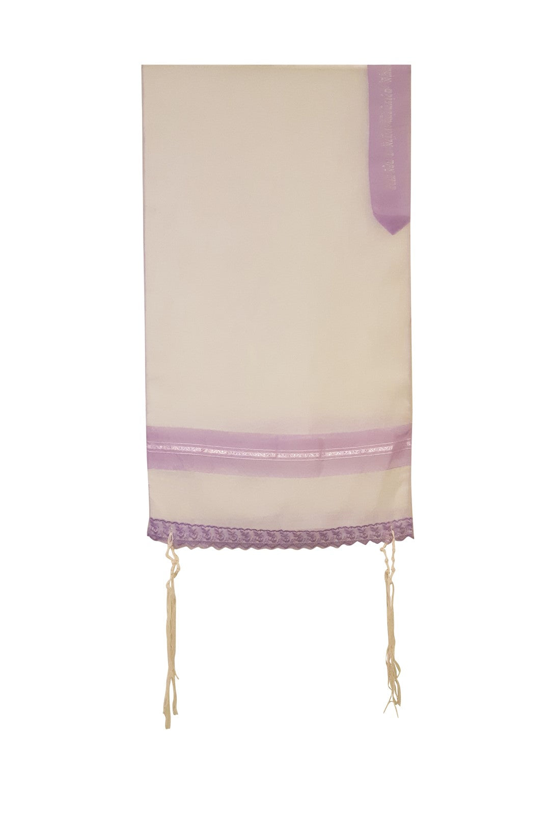 The tallit is made of sheer polyester, with a Lilac colored edge along the tallit that adds to this interesting feminine design.