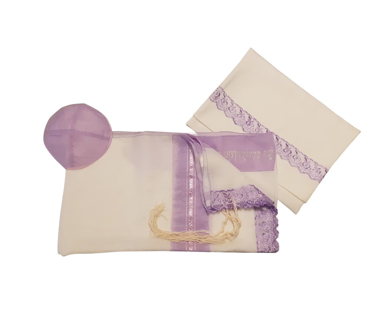 Like other Galilee Silks Tallit for girl, Bat Mitzvah Tallit designs, it comes in a set with a matching bag and kippah.