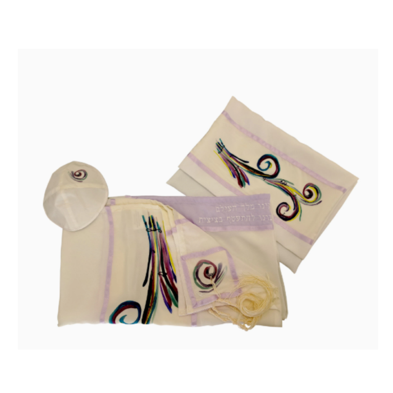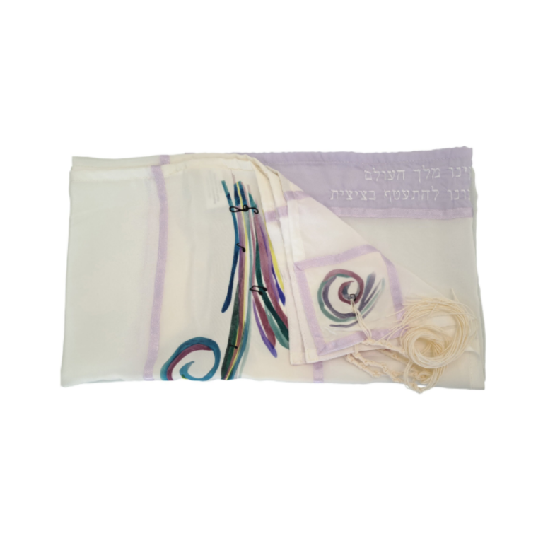 Lilac Atarah with the blessing embroidered in Hebrew.