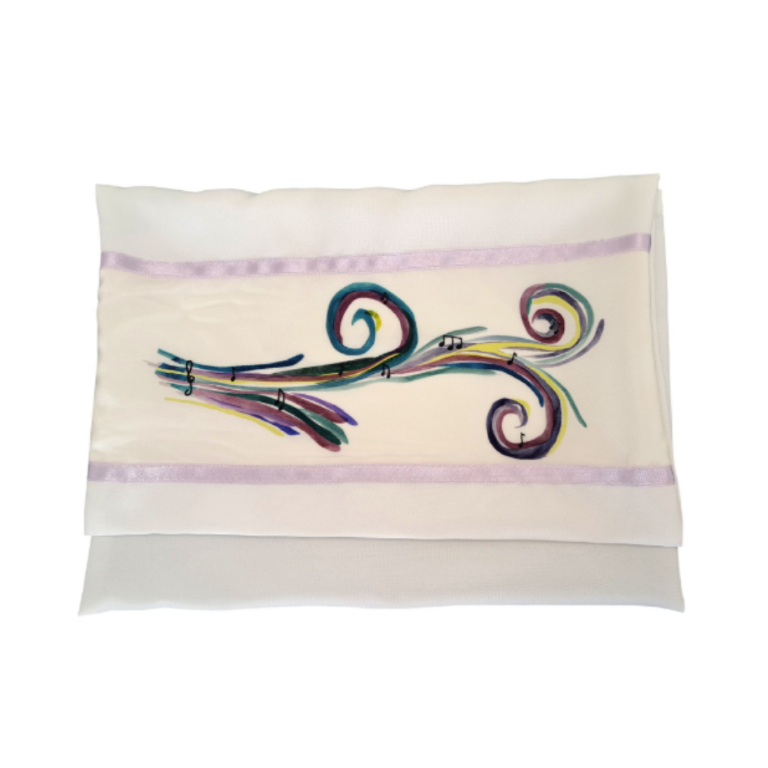 The Musical Tallit for women in Lilac Shades, Silk Tallit for girl, Bat Mitzvah Tallit, Women's Tallit, Cantor Tallit is a unique Tallit with printed artistic colorful waves with floating music notes in Black, on a light Blue Silk background.
